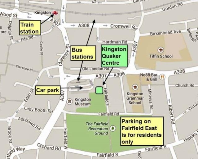 Our monthly meetings are held in the Kingston Quaker Centre, Fairfield East, Kingston upon Thames, KT1 2PT.