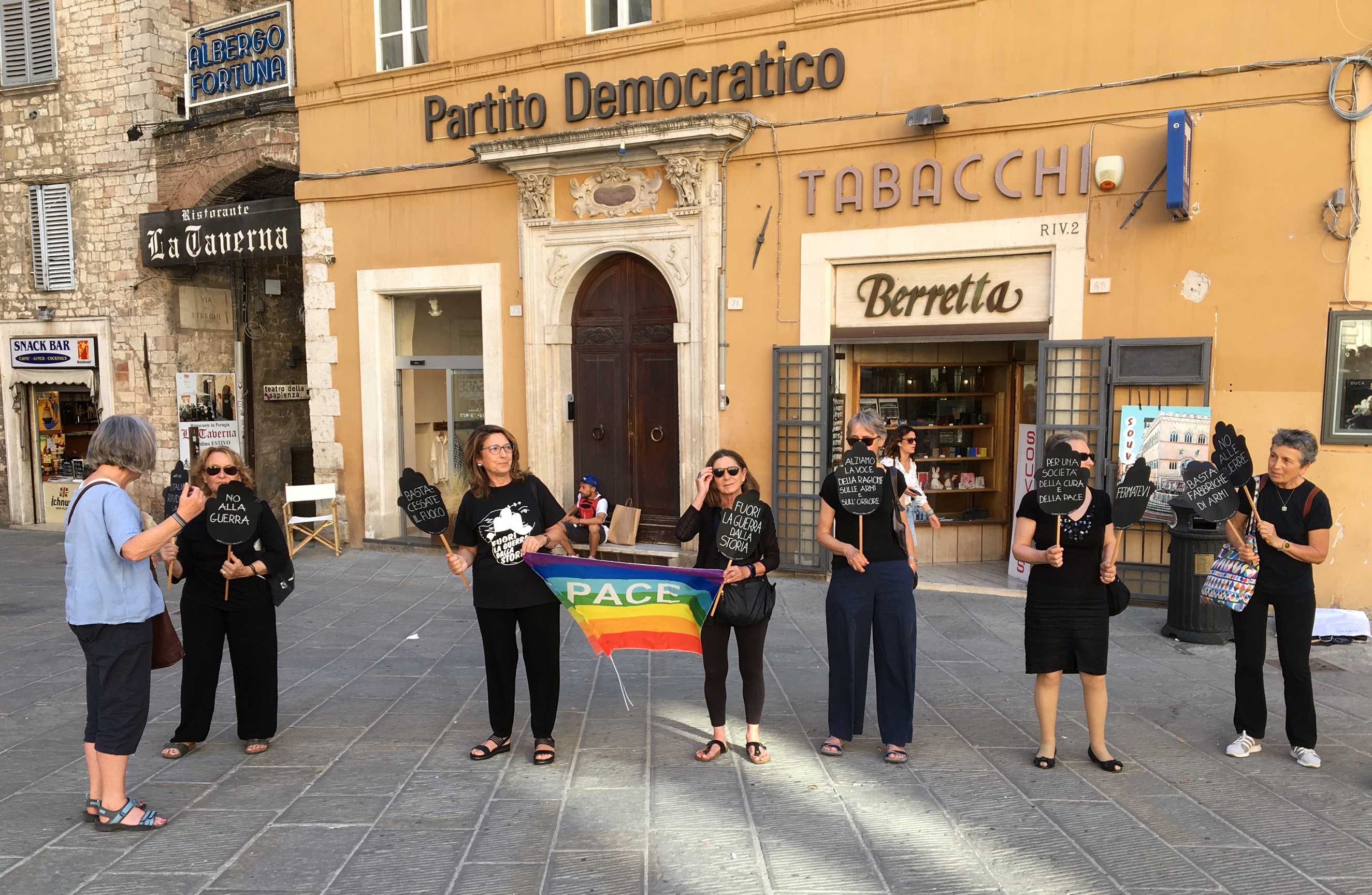 While away in Italy recently Ange and Phil Cooper encountered this peace demonstration in the centre of Perugia in Umbria. It seems that the Women in Black who are seen demonstrating against war every Wednesday evening beside the Edith Cavell statue near Trafalgar Square have counterparts in Italy.